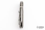 This Small Inkosi from Chris Reeve Knives features a tumble finished blade with dual anodized thumb studs and notched thumbrest. The handle is comprised of a bead blasted titanium frame over a single barrel spacer with a matching bead blasted titanium tip up clip. Micarta inlays. Includes original accessories. Excellent condition.