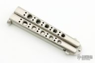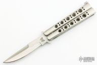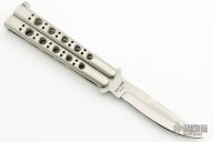 This early balisong from Pacific Cutlery features a Jody Samson ground satin finished blade with sharpened top edge. The handles are stainless steel with hole pattern.   Includes an original Bali-Song pamphlet.  Has scratches and some spots on the blade, otherwise excellent condition. Includes original nylon sheath.