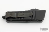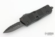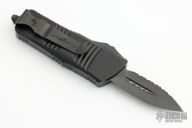 This Troodon Mini OTF automatic by Microtech knives features a DLC double edged blade with one fully serrated edge, and a black aluminum handle with DLC hardware, tip down stainless steel carry. Glass breaker. S/N 166. Dated 03/2022. Comes with original box and papers. New condition.