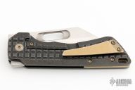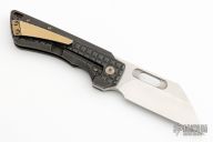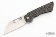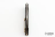 This Framelock Flipper by EMP EDC features a satin finished blade with notched thumbrest and flipper, and a thumbhole. The handle has a black tumbled and frag pattern milled frame, anodized titanium backspacer and tip up clip. Comes with original box and COA. Rides on bearings, nice detent, lockup and blade seating. Has some light scratches, otherwise excellent condition. "032-201" on the backspacer.