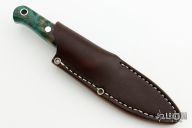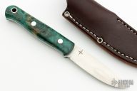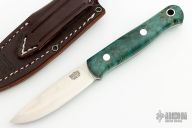 This fixed blade from Bark River Knives features a satin finish drop point blade with a scandi grind, .091" blade stock and .844" blade depth. The handle has dyed burl scales over full tang construction. Lanyard hole on pommel. Includes leather sheath and original box. Excellent condition.