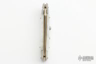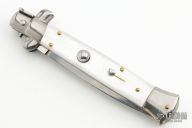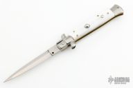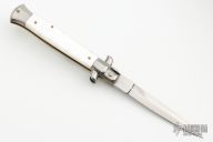 This Swivel Bolster by Frank Beltrame features a polished dagger ground blade with false top edge. The handle has stainless steel bolsters, front and rear, pearlex scales, brass liners, stainless spring. Excellent condition.