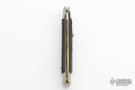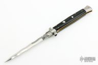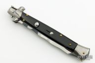 This Swivel Bolster Auto has a stainless steel kris blade. The handle is composed of a steel front and rear bolsters, brass liners all complemented by black acrylic scales. Excellent Condition.