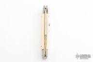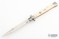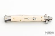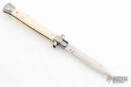 This Swivel Bolster by Frank Beltrame features a polished bayonet ground blade with false top edge. The handle has stainless steel bolsters, front and rear, imitation ivory scales, brass liners, stainless spring. Excellent condition.