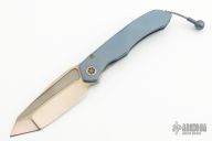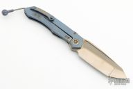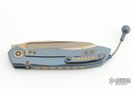 This Anax from Marfione Custom Knives features a bronzed hand rub satin finshed tanto blade with bead blasted cut-outs and satin flats, and a notched thumbrest. The handle has an integral titanium frame with optional lanyard attachment. Frame is anodized blue/bronze and hardware is anodized bronze. Nice detent, lockup and blade seating. "A. Marfione" inside the frame and dated 08/2015. Includes original box, zippered case and papers. Excellent condition.