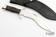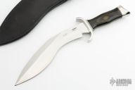 This custom Kukri by Gil Hibben is marked 40th Anniversary. It features a mirror polished stainless guard and pommel with dymondwood grip, hidden tang construction. The blade is mirror finished with sharpened top edge, .246" thick and 1.990" blade depth.  Includes a hand tooled black leather sheath and a zippered case. Excellent condition.
