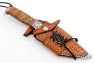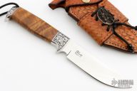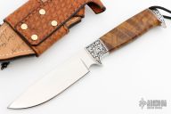 This Knife by D'Alton Holder features a mirror polished drop point blade with .195" blade thickness and 1.311" blade depth, hidden tang construction. The handle has an engraved stainless steel guard and butt, done by Pat Holder, wood grip with red and SS spacers. Beautiful combination of materials and excellent workmanship. Comes with a hand tooled brown leather sheath. Excellent condition.