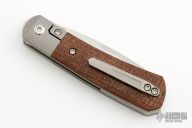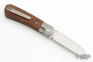 This Apache Front Flipper by Enrique Pena features a satin finished blade with a front flipper and notched thumbrest. The handle has titanium bolsters, brown burlap micarta scales with a titanium backspacer and matching tip up pocket clip. Includes a Pena X-Series padded box.  Excellent condition.