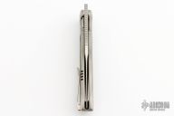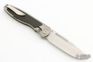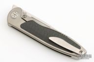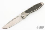 This Mini Tempest from Brian Nadeau features a hand rub satin finished drop point blade with a fuller and notched thumbrest/front flipper. The handle has a bead blasted titanium frame with carbon fiber inlays, satin titanium tip up clip. Nice detent, lockup and blade seating, stainless lockface insert. Includes original box. Excellent condition.