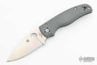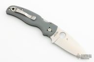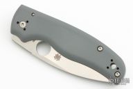 The new BladeOps Exclusive Spyderco Shaman features a gray G-10 handle, skeletonized stainless steel liners, a satin finshed leaf shaped ELMAX blade, and Spyderco's trademark round hole opening feature.