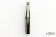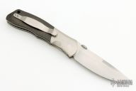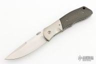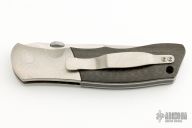 This SD-3 by John W Smith features a spear point hand rub satin finished blade with thumb-disc and notched thumbrest. The handle has dovetailed and orange peel finished titanium bolsters, orange peel finished titanium liners and tip up clip, lightning strike carbon fiber scales and a black G-10 backspacer. Nice detent, lockup, and blade seating. Excellent condition.