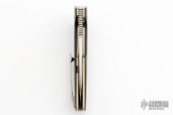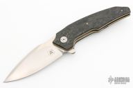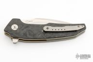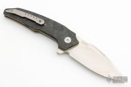 This Tashi Bharucha designed flipper by Andre Thorburn and Andre van Heerden features a spear point hand rub satin finished blade with a false top edge, notched thumbrest and flipper. The handle is comprised of marble carbon fiber scales, anodized titanium liners, carbon fiber backspacer, tip up titanium clip. Nice detent, lock up and blade seating. Has a couple light scuffs, otherwise excellent condition.