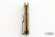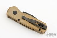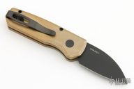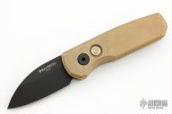 This Runt 5 by Pro-Tech features a black blade.  The handle features a stonewashed bronze aluminum frame with milled thumbrest, a stainless steel tip up pocket clip and a mosaic push button.  Comes with original box and papers. Excellent Condition.