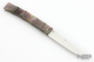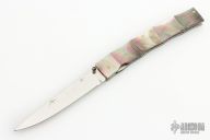 Koji primarily uses a powdered stainless steel known as Cowry-Y, made by Daido Steel in Japan, for his blades. It holds an excellent cutting edge and polishes to a high mirror finish. Although one of the drawbacks of powdered steel is its weakness towards lateral impact, this can be corrected through proper heat-treating. Koji also makes knives featuring ATS-34, D-2, 440C and other steel blades, based on customer preference. His preferred method of making blades is via stock removal. A folder specialist, he often carves the handle material into a terraced landscape to feature his classic "Air-Step" design.