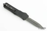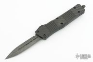 This Combat Troodon by Microtech Knives features a Damascus double edged blade. The handle is black aluminum and carbon fiber, ringed anodized titanium screws, and a black stainless steel pocket clip. The handle is marked "A. Marfione" and dated 08/2022 and #300 on spine of handle and claw logo. Excellent work. Comes with original box and papers. Excellent condition.
