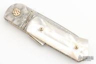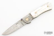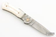 This Lockback by Howard Hitchmough features a Damascus drop point blade with gold plated thumb stud with sapphire inset, fileworked spine. The handle has fluted Damascus bolsters, carved mother of pearl scales with gold plated hardware over fileworked gold backspacer with stainless steel lock release, backspacer has 21 sapphires and 6 diamonds. Includes a zippered case. Truely a stunning piece. Excellent condition.