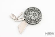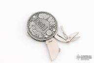 This Japan Yen Coin Knife by Max Knives is #040, it features a satin finished blade, scissors and a file. Comes with a zippered case. New from maker at the 2023 Blade Show.