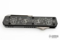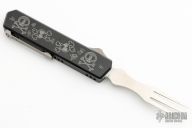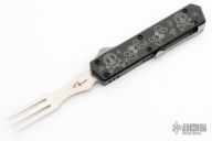 This G13 OTF Auto by Golgoth Knives features a satin finished fork blade. The handle has a black aluminum chassis with anodized titanium button and tip down titanium clip. Comes with velcro case. New from maker at the 2023 Blade Show.