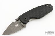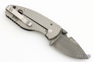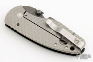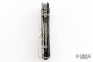 This HEAT/ F Plain Edge Framelock Folder has a black tumbled Elmax drop point blade with dual thumb studs, bottle opener, and a notched thumbrest. The handle has G-10 and gunmetal tumbled titanium, with a stainless steel tip up clip and removable glass breaker, lanyard hole. Includes light scratches on the pocket clip otherwise the knife is in excellent condition.