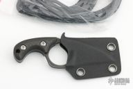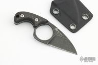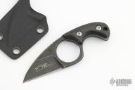 This knife by Max Knives is a Fred Perrin design, it features a black tumbled wharncliffe blade with finger hole, full tang construction. The handle has carbon fiber scales. Comes with a zippered case, kydex sheath and a length of paracord. New from maker at the 2023 Blade Show.