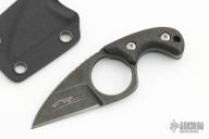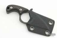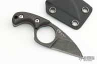 This knife by Max Knives is a Fred Perrin design, it features a black tumbled wharncliffe blade with finger hole, full tang construction. The handle has carbon fiber scales. Comes with a zippered case, kydex sheath and a length of paracord. New from maker at the 2023 Blade Show.