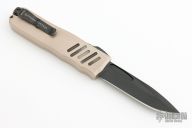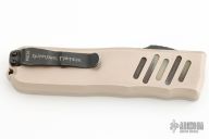 This Recon-035 by Guardian Tactical features a black drop point blade. The handle has a desert tan aluminum frame with black hardware and a black stainless steel pocket clip. Has some scuffs, otherwise good condition.