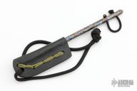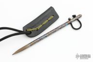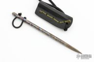 This flamed titanium spike by Fred Perrin has a triangular spike blade with a black cord finger loop at the butt. Comes with kydex sheath. New from maker at the 2023 Blade Show.