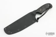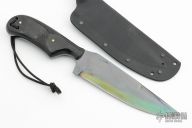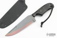 This PPF from Fred Perrin features a blued clip point blade with visible temper line, swedge and notched thumbrest, .157" blade stock and 1.627" blade depth, full tang construction. The handle is comprised of black linen micarta with nickel silver pins. Lanyard hole with lanyard in pommel. Comes with a kydex sheath. New from maker at the 2023 Blade Show.