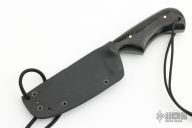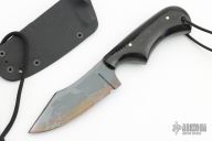 This Outdoor Bowie from Fred Perrin features a clip point blade with visible hamon, swedge and notched thumb rest, .144" blade stock and 1.350" blade depth, full tang construction. The handle is comprised of black linen micarta with nickel silver pins. Lanyard hole with lanyard in pommel. Includes kydex sheath. New from maker at the 2023 Blade Show.