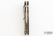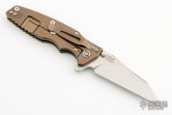 This Eklipse Flipper by Rick Hinderer Knives features a 3.5" stonewash finished blade, notched thumbrest and flipper, dual thumbstuds. The handle has a black G-10 scale, and bronzed stonewashed titanium handle/clip. Clip can be mounted for tip up or down carry. Nice lockup, seating, and detent. Comes with original box and extra hardware. New condition.