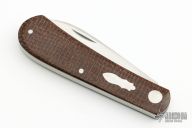 This Zulu Spear by Enrique Pena, has a hand rub satin finished blade with half-stop and a nail nick. The handle is composed of burlap micarta covers with black G-10 liners with satin finished stainless steel spring and liners. Spring flush in all positions. Comes with zippered case. Excellent condition.