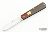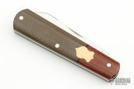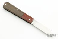 This slipjoint from Thys Meades features a hand rub satin finished blade with nail nick. The handle has micarta covers with stainless steel liners, spring and micarta sheild. Has half-stop, flush in all positions. Comes with zipper case.  Excellent Condition.