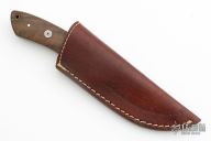 This knife by Sable Knives features a Damascus blade with .157" blade stock and 1.200" blade depth, full tang construction. The handle has has engraved stainless steel bolsters, walnut wood scales with mosaic pin and lanyard hole. Comes with a brown leather sheath and zippered case. Has some light scratches and oxidation, otherwise good condition.