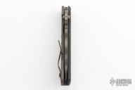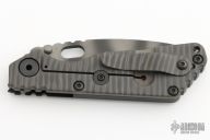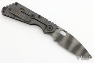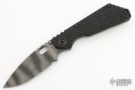 This SNG framelock folder by Mick Strider features a tiger stripe blade and a dimple pattern black G-10 and flamed titanium frame and tip up titanium clip. Includes a "Lock Bar Stabilizer" for maximum reverse lock retention. Nice detent, lockup and blade seating. New condition.