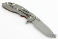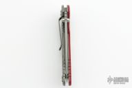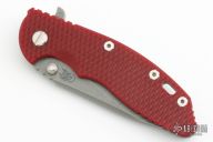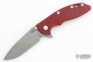 This Skinny XM-18 3.5" flipper by Rick Hinderer features a stonewashed blade with notched thumbrest and flipper. The handle has a stonewashed titanium frame with a red G-10 scale, a tip up or down reversible titanium clip and filler tab, lanyard hole at the butt. New condition. Comes with original box and extra hardware.