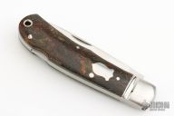 This Singapore Winchester by Jerry Halfrich features a hand rubbed, satin finished blade with nail nick. The handle has stainless steel fluted bolsters with integral liners, rag micarta covers with a stainless shield escutcheon, stainless spring and spacer and a lanyard hole at the butt. Nice flush lockup and centered blade. Comes with a zipper case. Has some light scuffs and scratches, excellent condition otherwise.