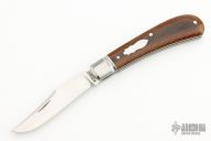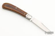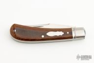 This Small Trapper by Rhidian Gatrill features a hand rub satin finished blade with nail nick. The handle has fluted stainless steel bolsters, brown canvas micarta covers, stainless steel escutcheon, liners and spring. Has half-stop, flush in all positions. Comes with a zippered case. Has some light scuffs and scratches otherwise excellent condition.