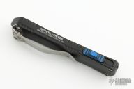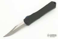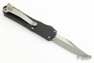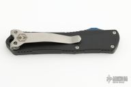 This Manticore-S by Heretic Knives features a two-tone bowie style blade. The handle has a black aluminum frame with a stainless steel tip down clip, blue G-10 thumb slide. Comes with original box and papers. Excellent condition.
