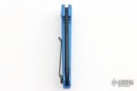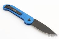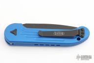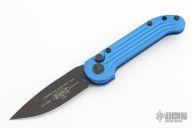 This LUDT side opening automatic by Microtech has a black finished blade with a standard edge and a contoured blue aluminum frame. Stainless steel clip. Dated 03/2019and serial number 10921. Comes with a Microtech box and papers. Has been resharpened, has some light scuffs, otherwise good condition.