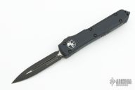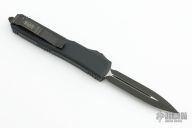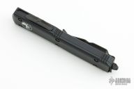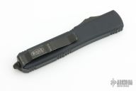 This Ultratech OTF automatic by Microtech Knives features a D/E blade with a standard edge and an all black tactical finish on the blade and handle. Black stainless steel clip. Glass breaker. S/N 113193 and dated 03/2019. It has some scuffs, otherwise excellent condition. Comes with original box and papers.