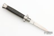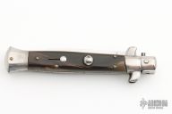 This Picklock auto stiletto features a drop point blade. The handle has silver bolsters front and rear, buffalo horn scales, and brass liners. Has safety. Has a few light scratches, excellent condition.