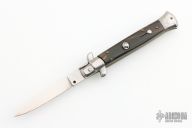 This Picklock auto stiletto features a drop point blade. The handle has silver bolsters front and rear, buffalo horn scales, and brass liners. Some spotting is visible on the backspring and blade otherwise the knife is in good condition.