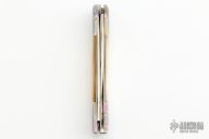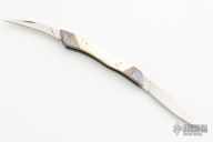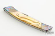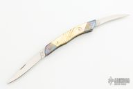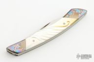 This Goldee by Terry Renner features 2 satin finished blades, one drop point and the other hawkbill/wharncliffe, both with nail nicks. The handle has titanium bolsters front and rear with free-hand color anodized Arabesques, hand carved gold lip pearl scales, and anodized titanium liners. Has a few light scratches on the blades and spine of handle, otherwise excellent condition.