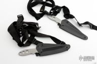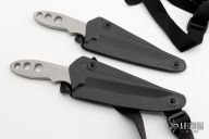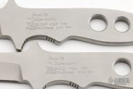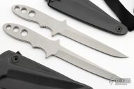 These "Jabberwockys" by Tom Maringer are the only two in existance. It was a special order and they are two of a kind. They feature bead blast finished blades with notched thumb and finger rests, full tang construction, .247" Blade Stock, .887" Blade Depth. Includes a kydex sheathes with should rigs and both have zippered cases. Has a couple of very light sheath marks and scratches, otherwise excellent condition. Dated 1984 and #265 and #266.