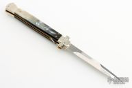 This lockback Auto by AGA Campolin has a mirror polished stainless steel spear point blade with false top edge. The handle has buffalo horn scales with mirror polished nickel silver bolsters, brass liners, stainless steel backspacer. Includes the original box and a brown leather slip sheath. Excellent Condition.
