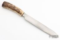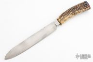 This knife by "Little" (Please let us know if you know this makers full name) features a hand rub satin finished blade with hamon and fileworked spine, .205" blade stock and 1.145" blade depth, hidden tang construction. The handle has a brass guard, stag grip and blued steel butt. Has a few light scratches, otheriwse excellent condition.
