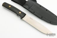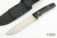 This Camp Knife from Dan Crotts features a satin finish drop point flat ground blade with .187" blade stock and 1.261" blade depth, full tang construction. The handle is comprised of maroon linen micarta scales with brass pins and lanyard tube. Includes kydex sheath with belt loop. Excellent condition.
