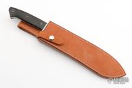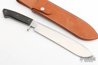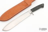 This Bolo Camp Knife by Lee Reeves features a mirror finished blade with .207" blade stock and 1.807" blade depth, full tang construction. The handle has a stainless steel guard, black linen micarta scales. Comes with a leather sheath. #07 on the blade. Has a few light scratches and patina, otherwise excellent condition.