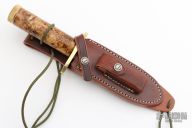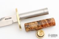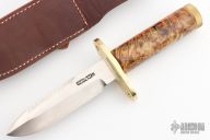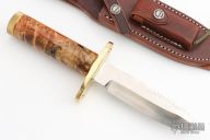 This Model 18-5.5 Attack Survival from Randall Made Knives has a spear point blade with sharpened top edge and sawteeth, .238" blade stock and 1.235" blade depth, hidden tang construction. The handle has a brass guard and knurled butt cap, smooth stainless steel handle. Comes with a brown leather sheath and original paper wrapping. New from maker at the 2023 Blade Show. This one comes with a custom Maple Burl sleeve that slides over the grip and is secured with the butt cap, giving it a totally new look!