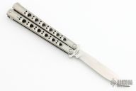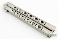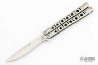 This Model 42 Balisong by Benchmade features a satin finished blade with swedge. The handle has an integral skeletonized titanium handles with spring latch on pommel. Comes with original nylon sheath and box. Excellent condition.